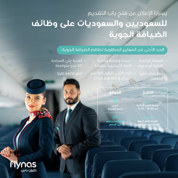 طيران ناس يعلن فتح باب التقديم لوظائف الضيافة الجوية (ثانوية فأعلى) بالدمام