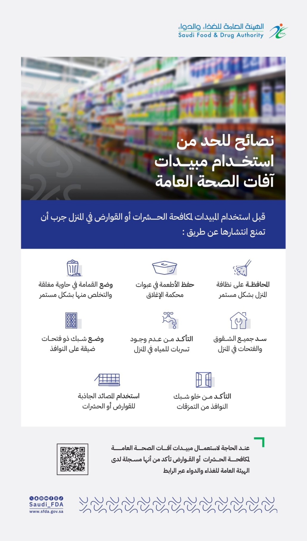 نصحت الهيئة العامة للغذاء والدواء، بالحد من استخدام المبيدات لمكافحة الحشرات أو القوارض في المنازل، مع أهمية التأكد من أن هذه المبيدات مُسجلة لدى الهيئة حال اللجوء لها.