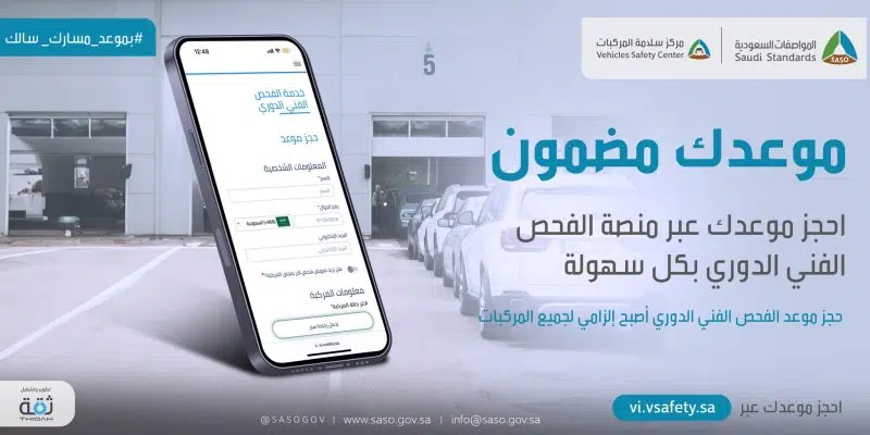 وأوضحت الهيئة أنه ابتداءً من 1 أكتوبر 2023 سيكون حجز موعد الفحص الفني الدوري إلزاميًّا لجميع المركبات، وذلك عبر منصة الفحص الفني الدوري على الرابط الإلكتروني: vi.vsafety.sa
